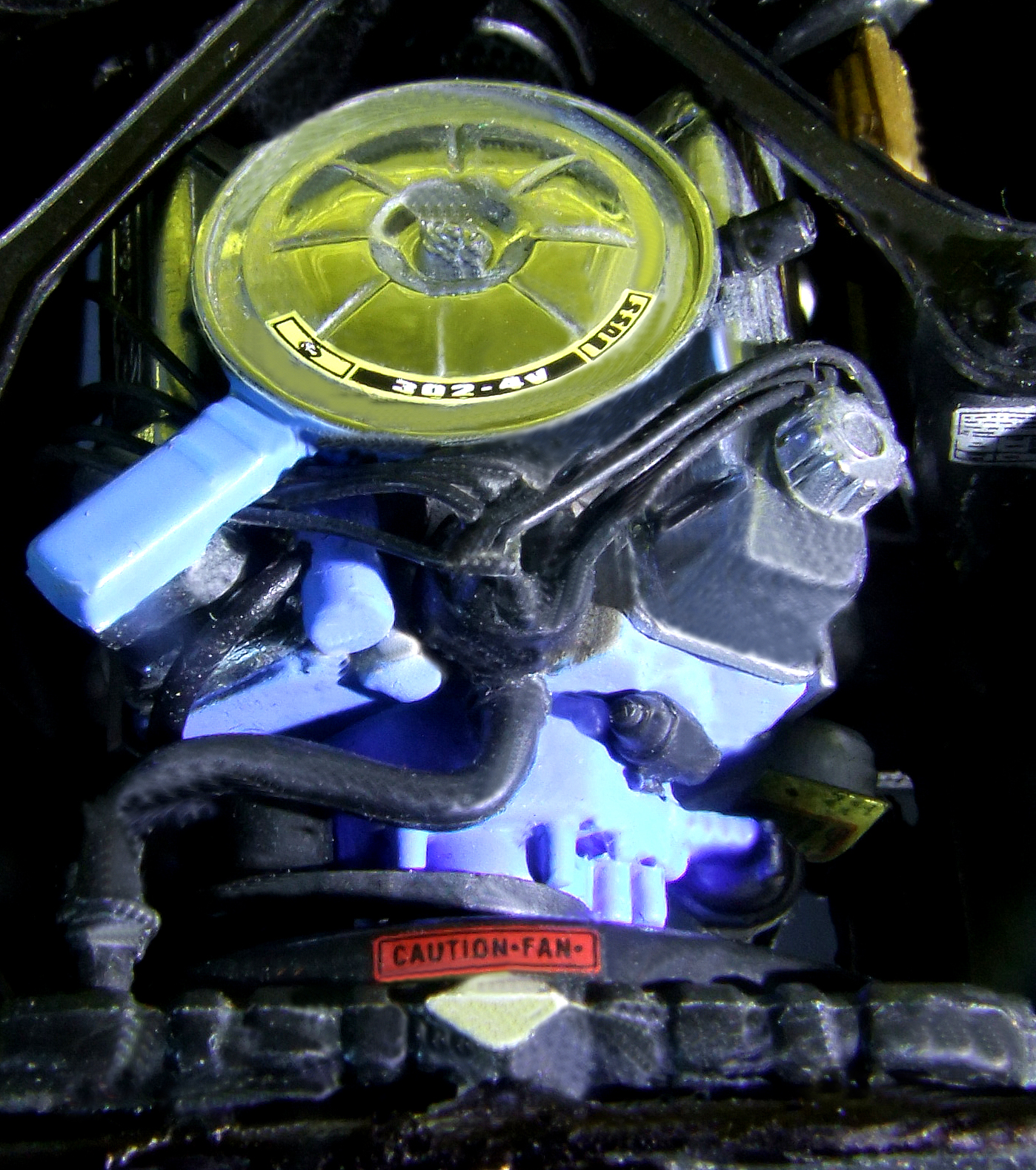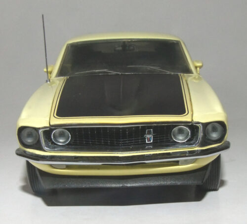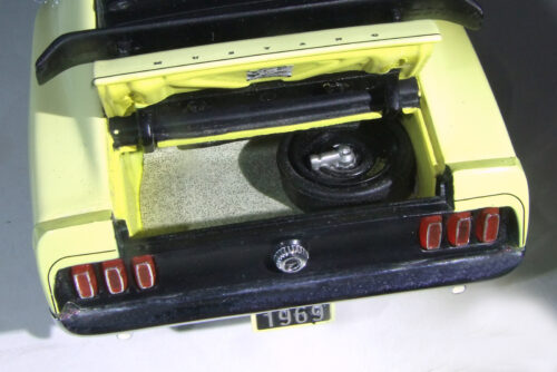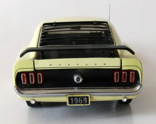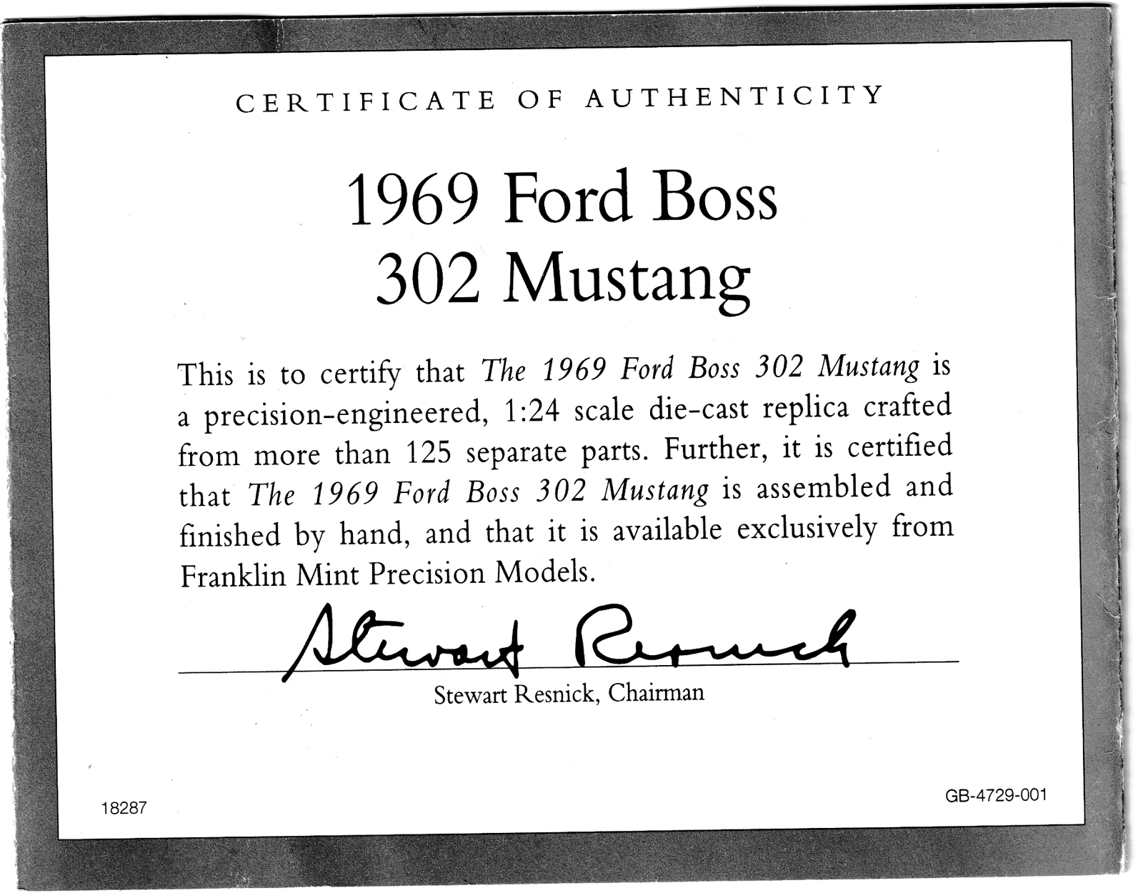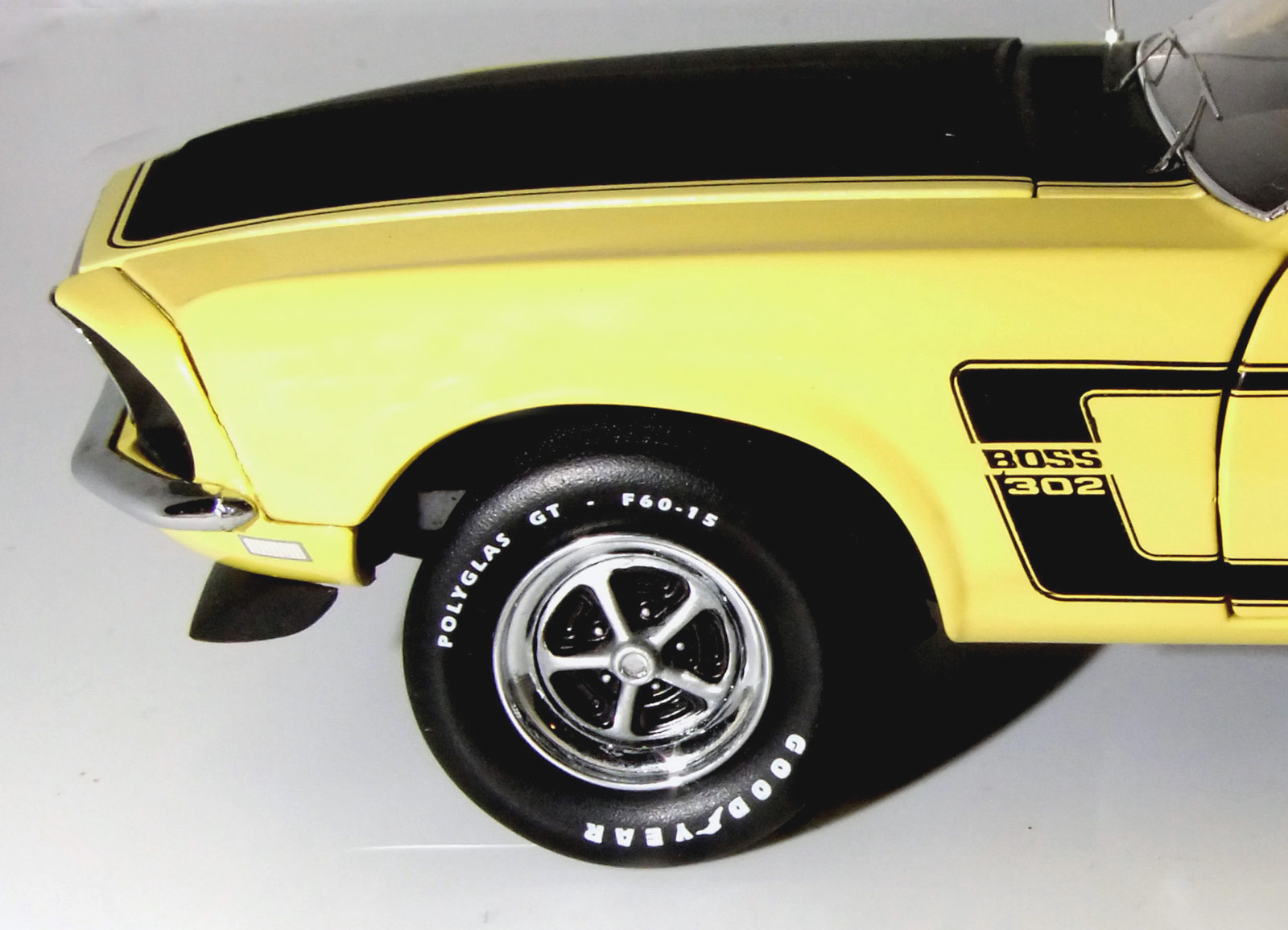 Ytterligare en perfekt Franklin Mint Mustang. BOSS 302 sidomarkeringarna finns på båda framskärmarna. Den svarta interiören är mycket detaljerad. Framstolarnas ryggstöd kan fälls framåt. Instrumentbrädan har mätare med läsbara siffror. Notera dekalerna på förardörrens kant. Öppna motorhuven och betrakta den detaljerade 302 V8-motorn som har tändkablar. Där finns oljefiltret och luftrenaren med skalenliga dekaler. I bagageutrymmet finns ett litet reservhjul och en perfekt miniatyriserad dekal om domkraftens handhavande på bagageluckans innsida. I framvagnen finns stabilisatorstag och styrstag som fungerar liksom fjädringen. I bakvagnen finns stötdämparna i rätt orange färg.