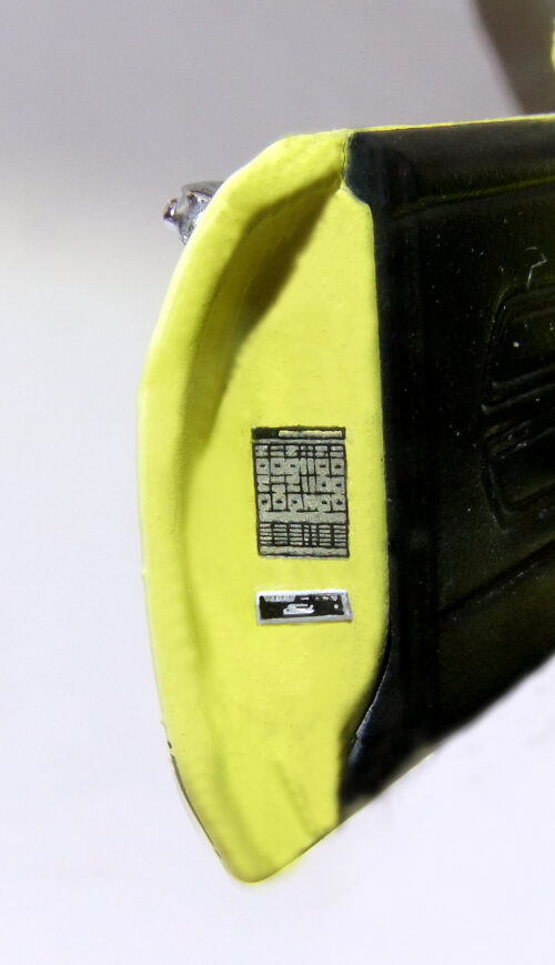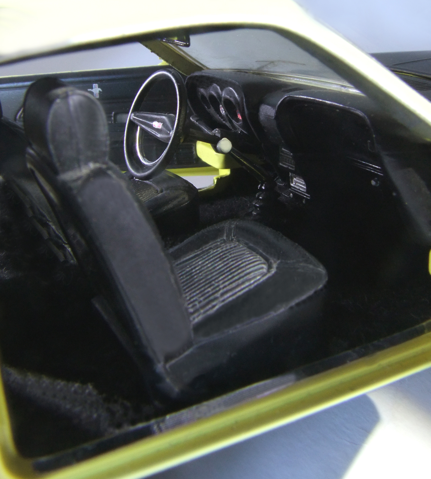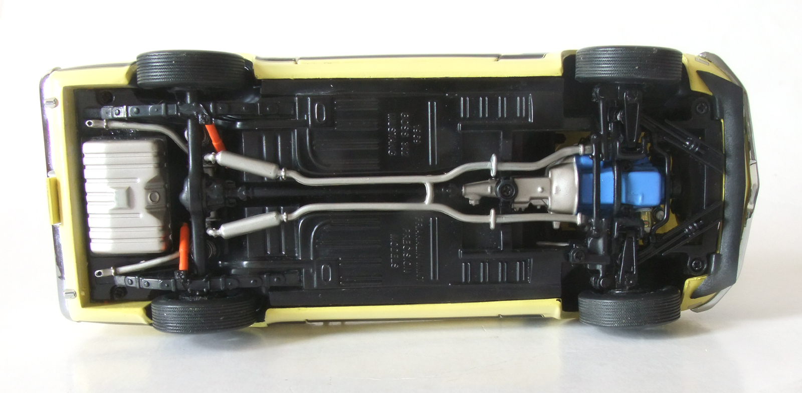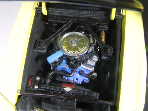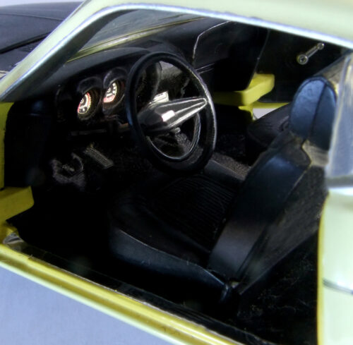 Ytterligare en perfekt Franklin Mint Mustang. BOSS 302 sidomarkeringarna finns på båda framskärmarna. Den svarta interiören är mycket detaljerad. Framstolarnas ryggstöd kan fälls framåt. Instrumentbrädan har mätare med läsbara siffror. Notera dekalerna på förardörrens kant. Öppna motorhuven och betrakta den detaljerade 302 V8-motorn som har tändkablar. Där finns oljefiltret och luftrenaren med skalenliga dekaler. I bagageutrymmet finns ett litet reservhjul och en perfekt miniatyriserad dekal om domkraftens handhavande på bagageluckans innsida. I framvagnen finns stabilisatorstag och styrstag som fungerar liksom fjädringen. I bakvagnen finns stötdämparna i rätt orange färg.